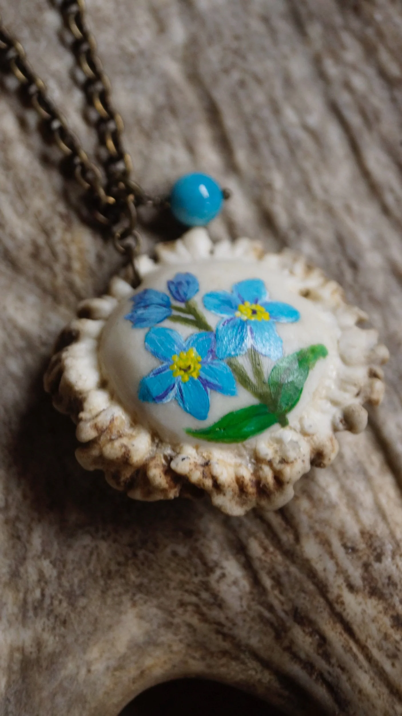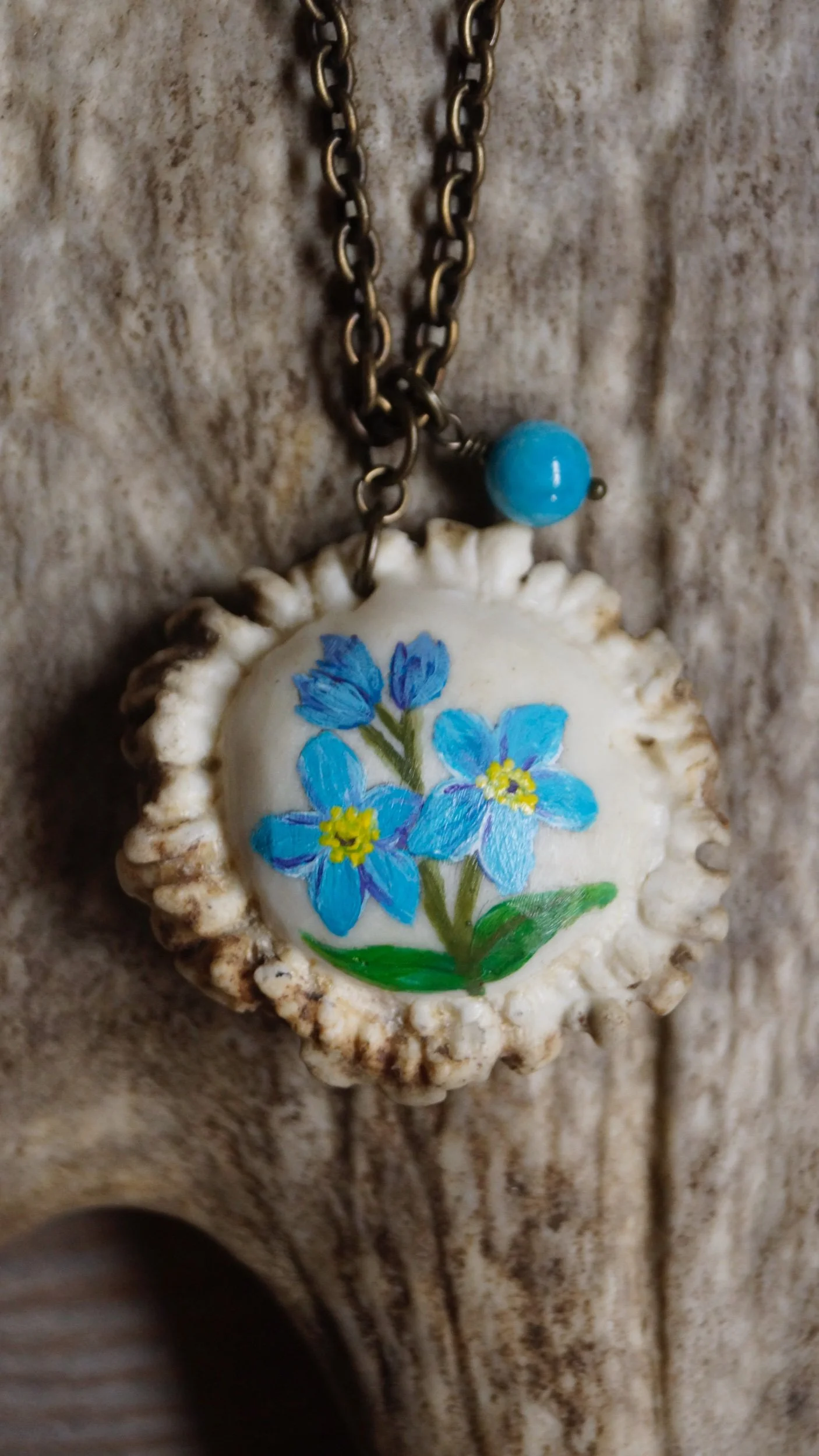 Shop Antler Jewelry › Forget Me Not Antler Burr Pendant Image 1 of 3 Image 2 of 3 Image 3 of 3 Forget Me Not Antler Burr Pendant CA$55.00 This hand painted Antler Burr is on a 24in chain! The burr measures 1.5in and is accented with an Apatite bead! Add To Cart Added! This hand painted Antler Burr is on a 24in chain! The burr measures 1.5in and is accented with an Apatite bead!