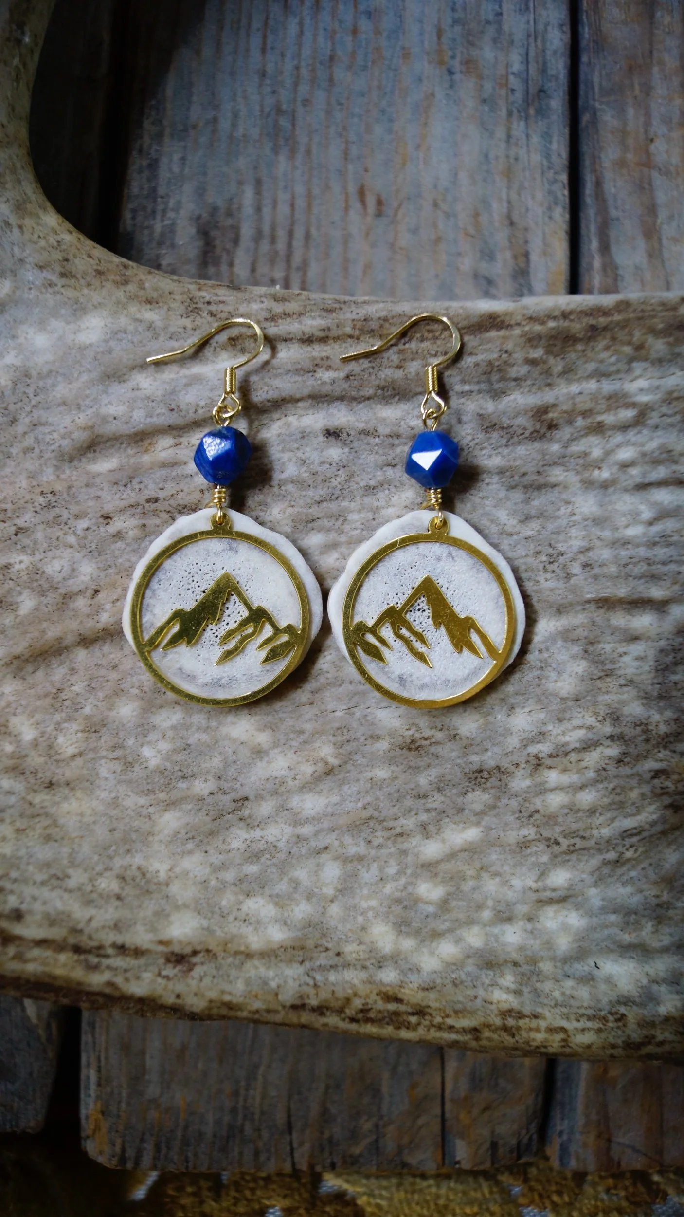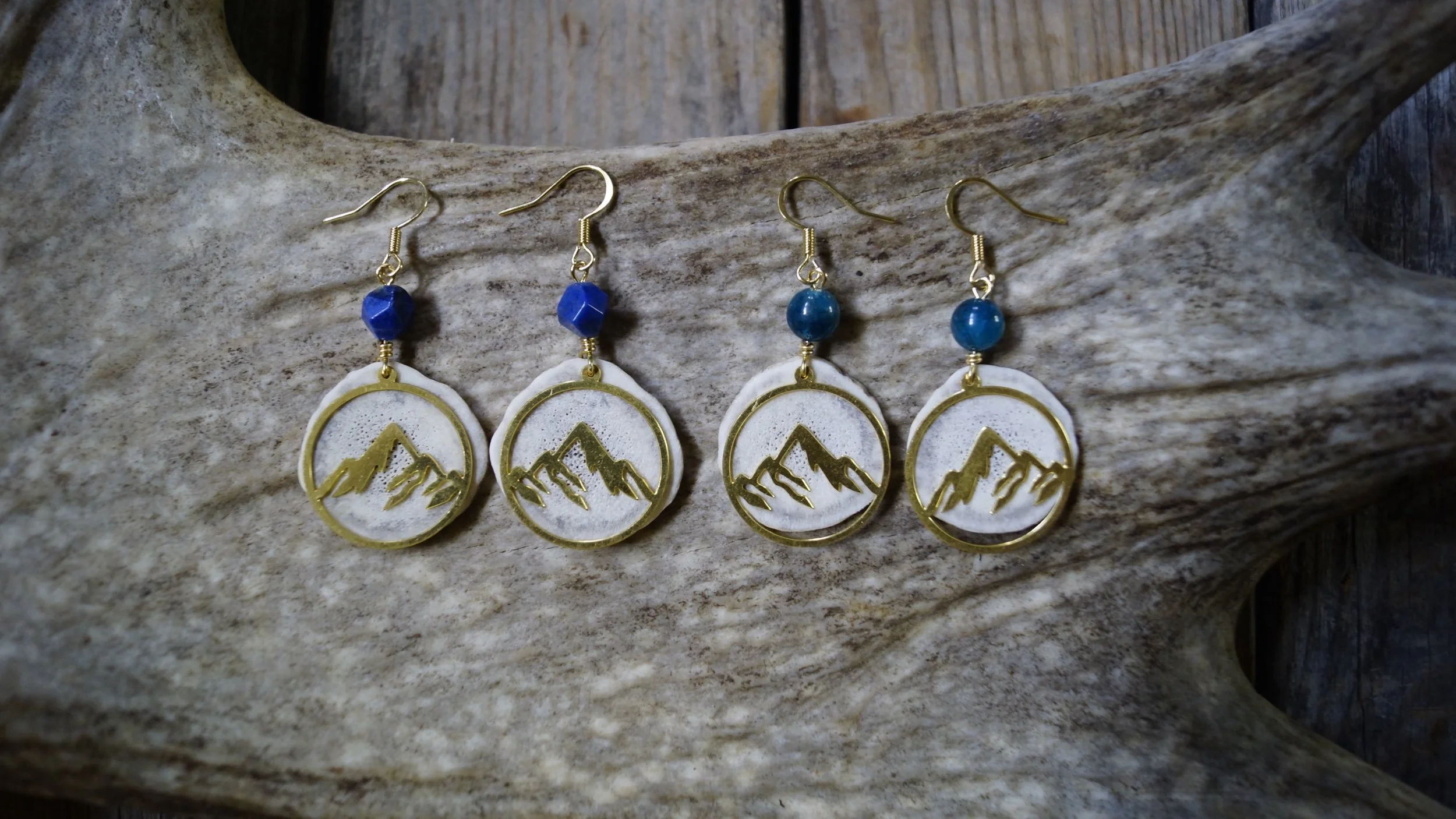 Shop Antler Jewelry › Mountain Antler Earrings Image 1 of 3 Image 2 of 3 Image 3 of 3 Mountain Antler Earrings CA$35.00 These measure 2.5in long & are 1.25in wide! Big round chonkers! Gemstone: Apatite (light blue) Dumortierite (dark blue) Add To Cart Added! These measure 2.5in long & are 1.25in wide! Big round chonkers!